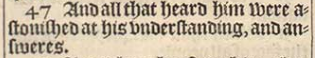 47 And all that heard him were astonished at his vnderstanding, and answeres.