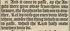 15 And it came to passe, as the Angels were gone away from them into heauen, the shepheards said one to another, Let vs now goe euen vnto Bethlehem, and see this thing which is come to passe, which the Lord hath made knowen vnto vs.