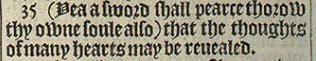 35 (Yea a sword shall pearce thorow thy owne soule also) that the thoughts of many hearts may be reuealed.