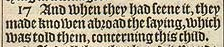 17 And when they had seene it, they made knowen abroad the saying, which was told them, concerning this child.