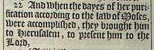 22 And when the dayes of her purification according to the law of Moses, were accomplished, they brought him to Hierusalem, to present him to the Lord,