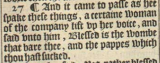 27 ¶ And it came to passe as hee spake these things, a certaine woman of the company lift vp her voice, and said vnto him, Blessed is the wombe that bare thee, and the pappes which thou hast sucked.