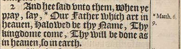2 And hee said vnto them, When ye pray, say, *Our Father which art in heauen, Halowed be thy Name, Thy kingdome come, Thy will be done as in heauen, so in earth.[*Matth 6. 9]