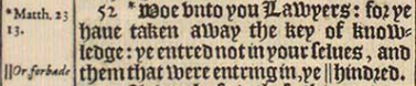 52 *Woe vnto you Lawyers: for ye haue taken away the key of knowledge: ye entred not in your selues, and them that were entring in, ye ||hindred.[*Matth. 23 13. , ||Or forbade]