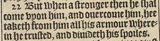 22 But when a stronger then he shal come vpon him, and ouercome him, hee taketh from him all his armour wherein he trusted, and diuideth his spoiles.