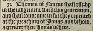 32 The men of Nineue shall rise vp in the iudgement with this generation, and shall condemne it: for they repented at the preaching of Ionas, and behold, a greater then Ionas is here.