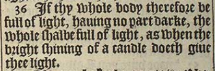 36 If thy whole body therefore be full of light, hauing no part darke, the whole shalbe full of light, as when the bright shining of a candle doeth giue thee light.