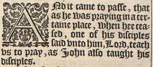 1 And it came to passe, that as he was praying in a certaine place, when hee ceased, one of his disciples said vnto him, Lord, teach vs to pray, as Iohn also taught his disciples.