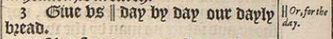 3 Giue vs || day by day our dayly bread.[|| Or, for the day.]