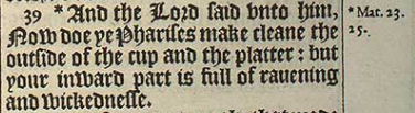 39 *And the Lord said vnto him, Now doe ye Pharises make cleane the outside of the cup and the platter: but your inward part is full of rauening and wickednesse.[*Mat. 23. 25.]