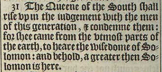 31 The Queene of the South shall rise vp in the iudgement with the men of this generation, & condemne them: for shee came from the vtmost parts of the earth, to heare the wisedome of Solomon: and behold, a greater then Solomon is here.