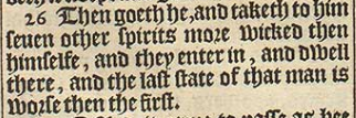 26 Then goeth he, and taketh to him seuen other spirits more wicked then himselfe, and they enter in, and dwell there, and the last state of that man is worse then the first.