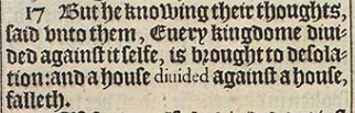17 But he knowing their thoughts, said vnto them, Euery kingdome diuided against it selfe, is brought to desolation: and a house diuided against a house, falleth.