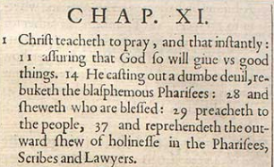 1 Christus lehrt zu beten und das sofort: 11 Versichernd, dass Gott uns so gute Dinge geben wird. 14 Er treibt einen stummen Teufel aus, tadelt die lästerlichen Pharisäer: 28 Und zeigt, welche selig sind: 29 Predigt zu den Leuten 37 und tadelt den äußeren Schein der Heiligkeit bei den Pharisäern, Schriftgelehrten und Gesetzeskundigen.