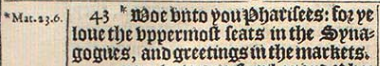 43 *Woe vnto you Pharisees: for ye loue the vppermost seats in the Synagogues, and greetings in the markets.[*Mat.23.6]