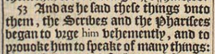 53 And as he said these things vnto them, the Scribes and the Pharisees began to vrge him vehemently, and to prouoke him to speake of many things: