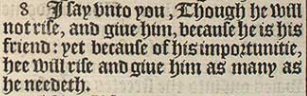 8 I say vnto you, Though he will not rise, and giue him, because he is his friend: yet because of his importunitie, hee will rise and giue him as many as he needeth.