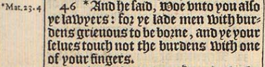 46 *And he said, Woe vnto you also ye lawyers: for ye lade men with burdens grieuous to be borne, and ye your selues touch not the burdens with one of your fingers.[*Mat.23.4]