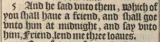 5 And he said vnto them, Which of you shall haue a friend, and shall goe vnto him at midnight, and say vnto him, Friend, lend me three loaues.