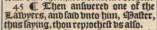 45 ¶ Then answered one of the Lawyers, and said vnto him, Master, thus saying, thou reprochest vs also.