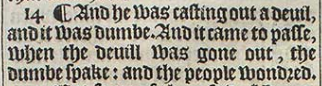 14 ¶ And he was casting out a deuil, and it was dumbe. And it came to passe, when the deuill was gone out, the dumbe spake: and the people wondred.