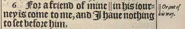 6 For a friend of mine in his iourney is come to me, and I haue nothing to set before him,[|| Or, out of his way.]