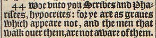 44 Woe vnto you Scribes and Pharisees, hypocrites: for ye are as graues which appeare not, and the men that walk ouer them, are not aware of them.