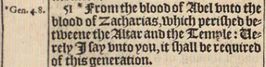 51 *From the blood of Abel vnto the blood of Zacharias, which perished betweene the Altar and the Temple: Uerely I say vnto you, it shall be required of this generation.[*Gen. 4. 8.]