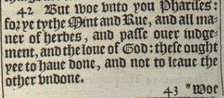 42 But woe vnto you Pharises: for ye tythe Mint and Rue, and all maner of herbes, and passe ouer iudgement, and the loue of God: these ought yee to haue done, and not to leaue the other vndone.