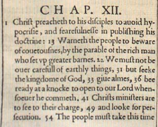 1 Christus predigt seinen Jüngern, Heuchelei und Furchtsamkeit beim Veröffentlichen seiner Lehre zu vermeiden: 13 Warnt die Leute, sich vor Begehrlichkeiten zu hüten, durch die Parabel vom reichen Mann, der größere Scheunen aufstellte. 22 Wir dürfen nicht über fürsorglich sein für irdische Dinge, 31 sondern müssen das Königreich Gottes suchen, 33 Almosen geben, 36 beim Klopfen bereit sein unserem Herrn zu öffnen, wann auch immer er kommt. 41 Christus' Gesandte haben ihre Aufgabe zu erfüllen, 49 und Verfolgung zu erwarten. 54 Die Leute müssen diese Zeit der Güte ergreifen, 58 denn es ist eine furchtbare Sache, ohne Vergebung zu sterben.