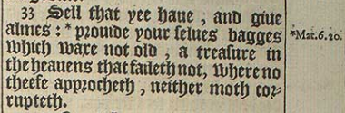 33 Sell that yee haue, and giue almes: *prouide your selues bagges which waxe not old, a treasure in the heauens that faileth not, where no theefe approcheth, neither moth corrupteth.[*Mat. 6. 20.]