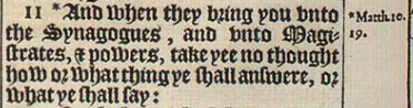 11 *And when they bring you vnto the Synagogues, and vnto Magistrates, & powers, take yee no thought how or what thing ye shall answere, or what ye shall say:[*Matth.10. 19.]