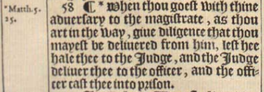 58 ¶ *When thou goest with thine aduersary to the magistrate, as thou art in the way, giue diligence that thou mayest be deliuered from him, lest hee hale thee to the Iudge, and the Iudge deliuer thee to the officer, and the officer cast thee into prison.[*Matth. 5. 25.]