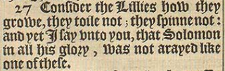27 Consider the Lillies how they growe, they toile not; they spinne not: and yet I say vnto you, that Solomon in all his glory, was not arayed like one of these.