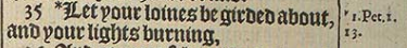 35 *Let your loines be girded about, and your lights burning,[*1.Pet.1. 13.]