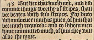 48 But hee that knew not, and did commit things worthy of stripes, shall bee beaten with few stripes. For vnto whomsoeuer much is giuen, of him shal bee much required: and to whom men haue committed much, of him they will aske the more.