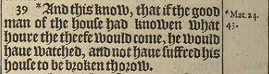 39 *And this know, that if the good man of the house had knowen what houre the theefe would come, he would haue watched, and not haue suffred his house to be broken thorow.[*Mat. 24. 43.]