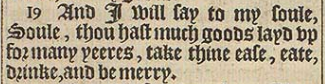 19 And I will say to my soule, Soule, thou hast much goods layd vp for many yeeres, take thine ease, eate, drinke, and be merry.