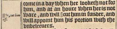 46 The Lord of that seruant will come in a day when hee looketh not for him, and at an houre when hee is not ware, and will || cut him in sunder, and will appoint him his portion with the vnbeleeuers.[|| Or, cut him off.]