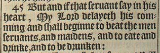 45 But and if that seruant say in his heart, My Lord delayeth his comming and shall beginne to beat the men seruants, and maidens, and to eate and drinke, and to be drunken: