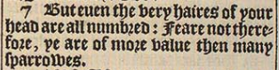7 But euen the very haires of your head are all numbred: Feare not therefore, ye are of more value then many sparrowes.