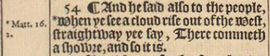 54 ¶ And he said also to the people, *When ye see a cloud rise out of the West, straightway yee say, There commeth a showre, and so it is.[*Matt. 16. 2.]