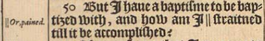 50 But I haue a baptisme to be baptized with, and how am I ||straitned till it be accomplished?[|| Or, pained.]