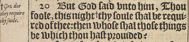 20 But God said vnto him, Thou foole, this night +thy soule shal be required of thee: then whose shal those things be which thou hast prouided?[ +Gre. doe they require thy soule.]