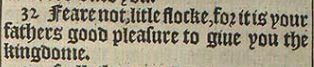 32 Feare not, litle flocke, for it is your fathers good pleasure to giue you the kingdome.