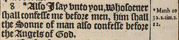 8 *Also I say vnto you, Whosoeuer shall confesse me before men, him shall the Sonne of man also confesse before the Angels of God.[*Matth. 10 32. 2.tim. 2. 12.]