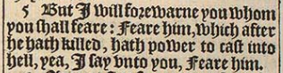 5 But I will forewarne you whom you shall feare: Feare him, which after he hath killed, hath power to cast into hell, yea, I say vnto you, Feare him.