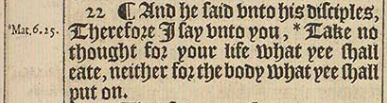 22 ¶ Und er sagte zu seinen Jüngern "Darum sage ich euch, *'kümmert euch nicht um euer Leben, was ihr essen werdet, noch darum, was ihr am Körper tragen werdet.[*Matthäus 6:25]