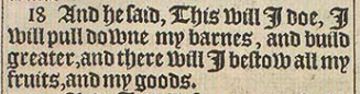 18 And he said, This will I doe, I will pull downe my barnes, and build greater, and there will I bestow all my fruits, and my goods.