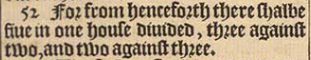 52 For from henceforth there shalbe fiue in one house diuided, three against two, and two against three.